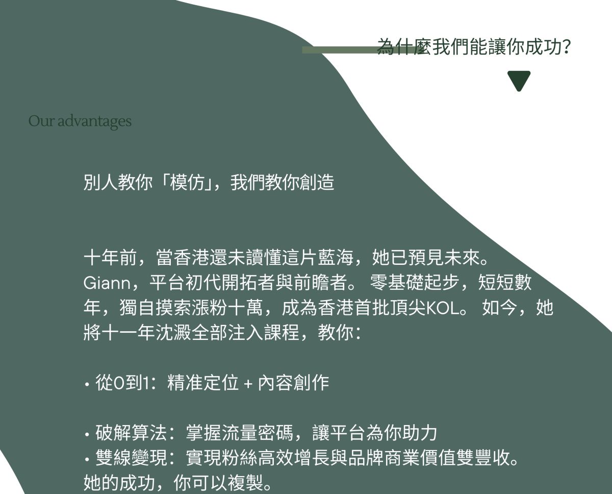 從2013至今,作為初代KOL,Giann 成功將影響力變現為業配、自創品牌、不同生意,聯盟營銷等多重收入流。我將教你這套讓我超過10年不敗的「個人商業模式」,讓你不再為單一收入擔心,打造屬於自己的變現系統。